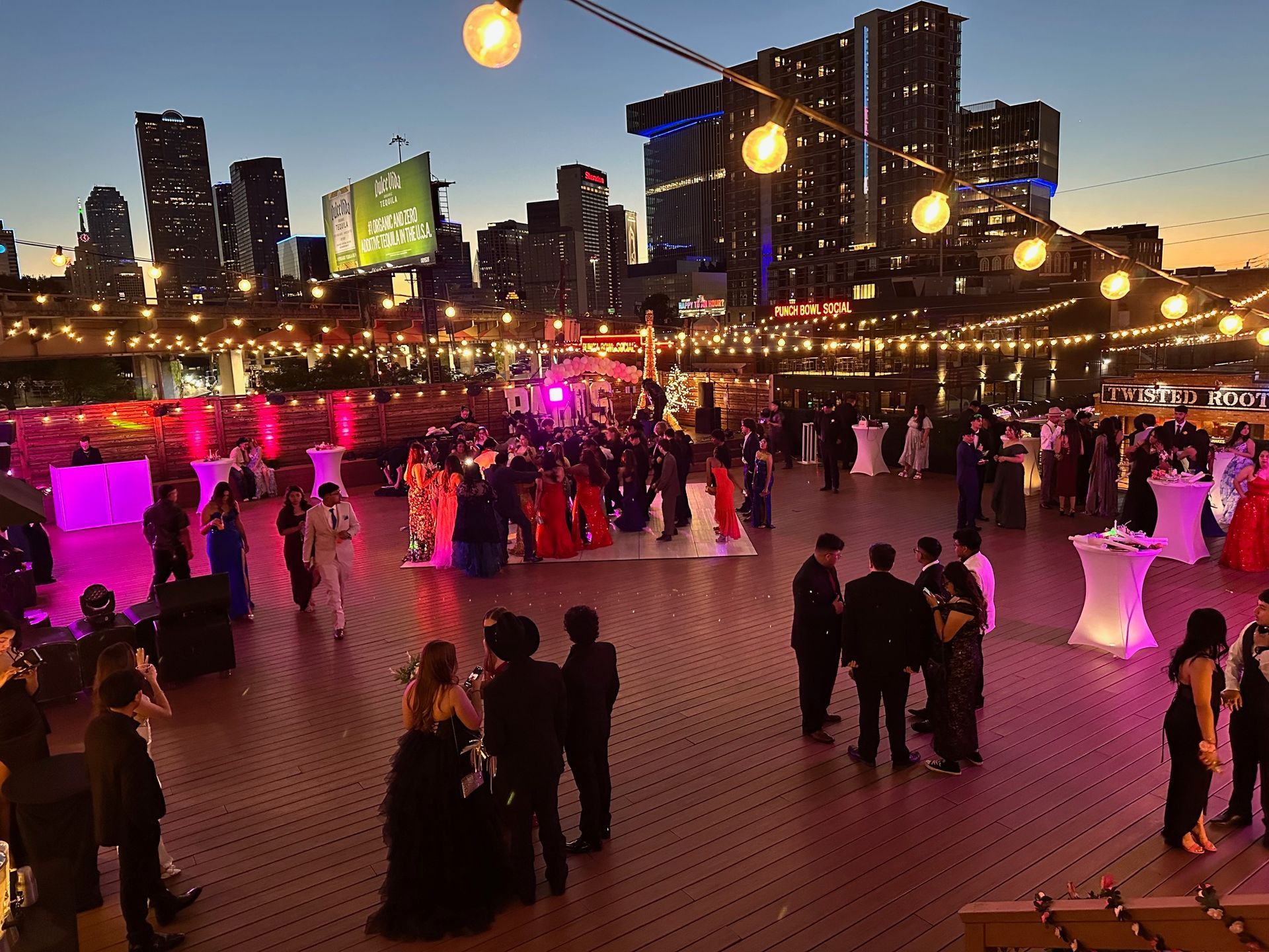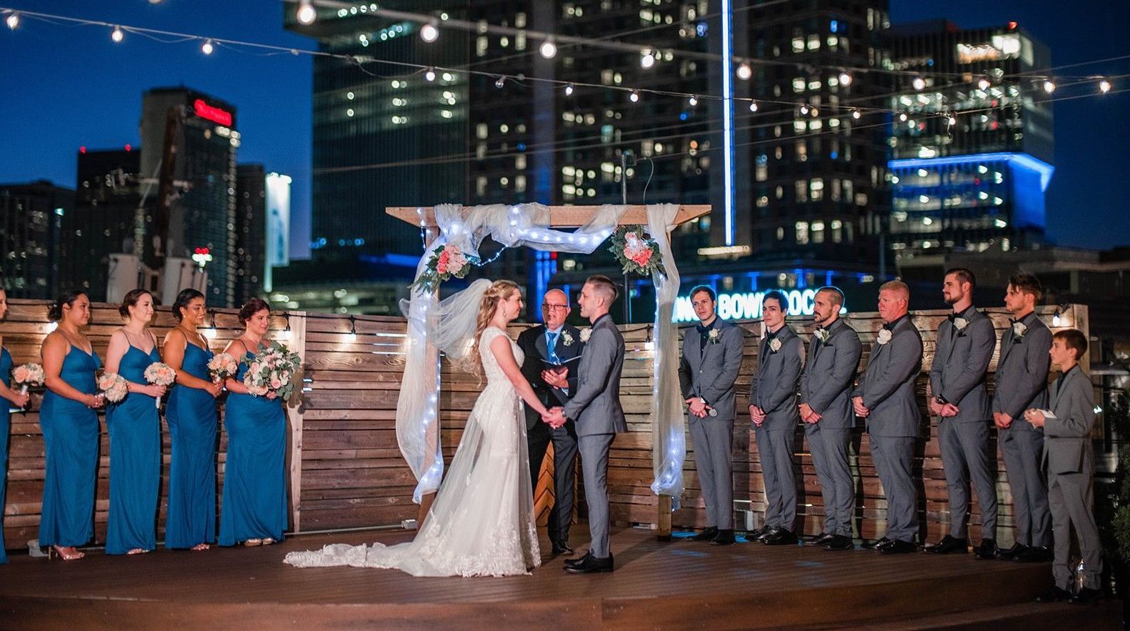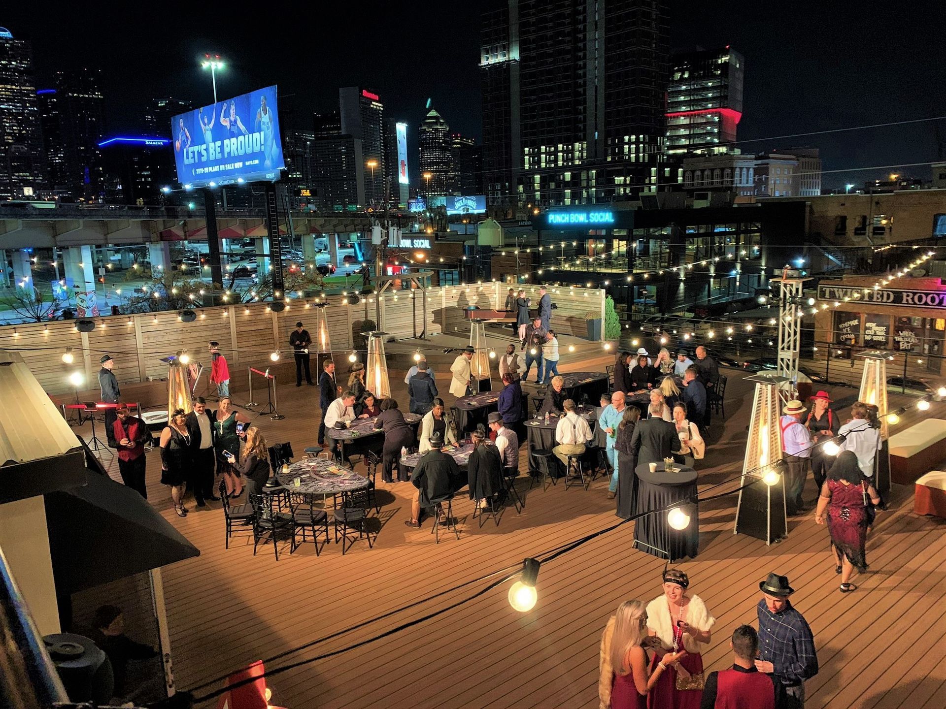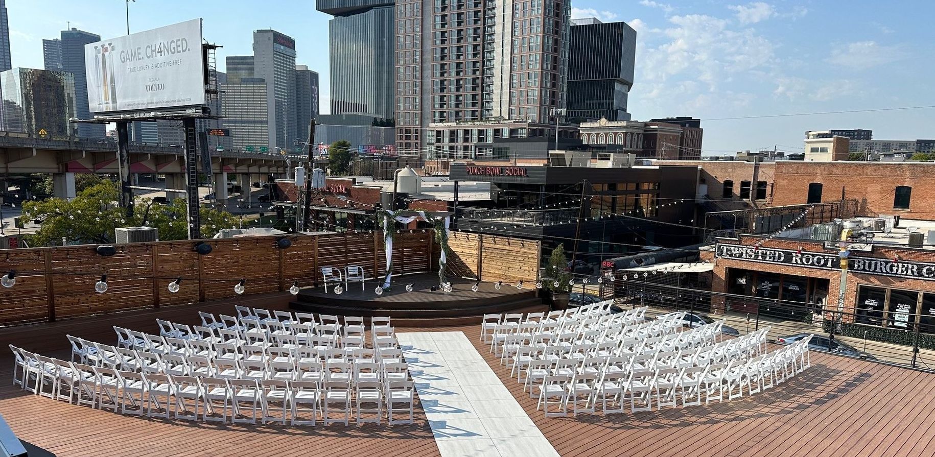 The rooftop deck is 4,500 square feet of open-air deck with breathtaking views of downtown Dallas. It includes globe string lighting, a stage, and a cedar bar to serve your guests from. This space can accommodate up to 200 guests for a full seated dinner with a dance floor. Celebrate your event under the stars with the downtown Dallas skyline as your backdrop. Perfect for rooftop wedding ceremonies, rooftop receptions, product launch events, birthday parties, and holiday parties.