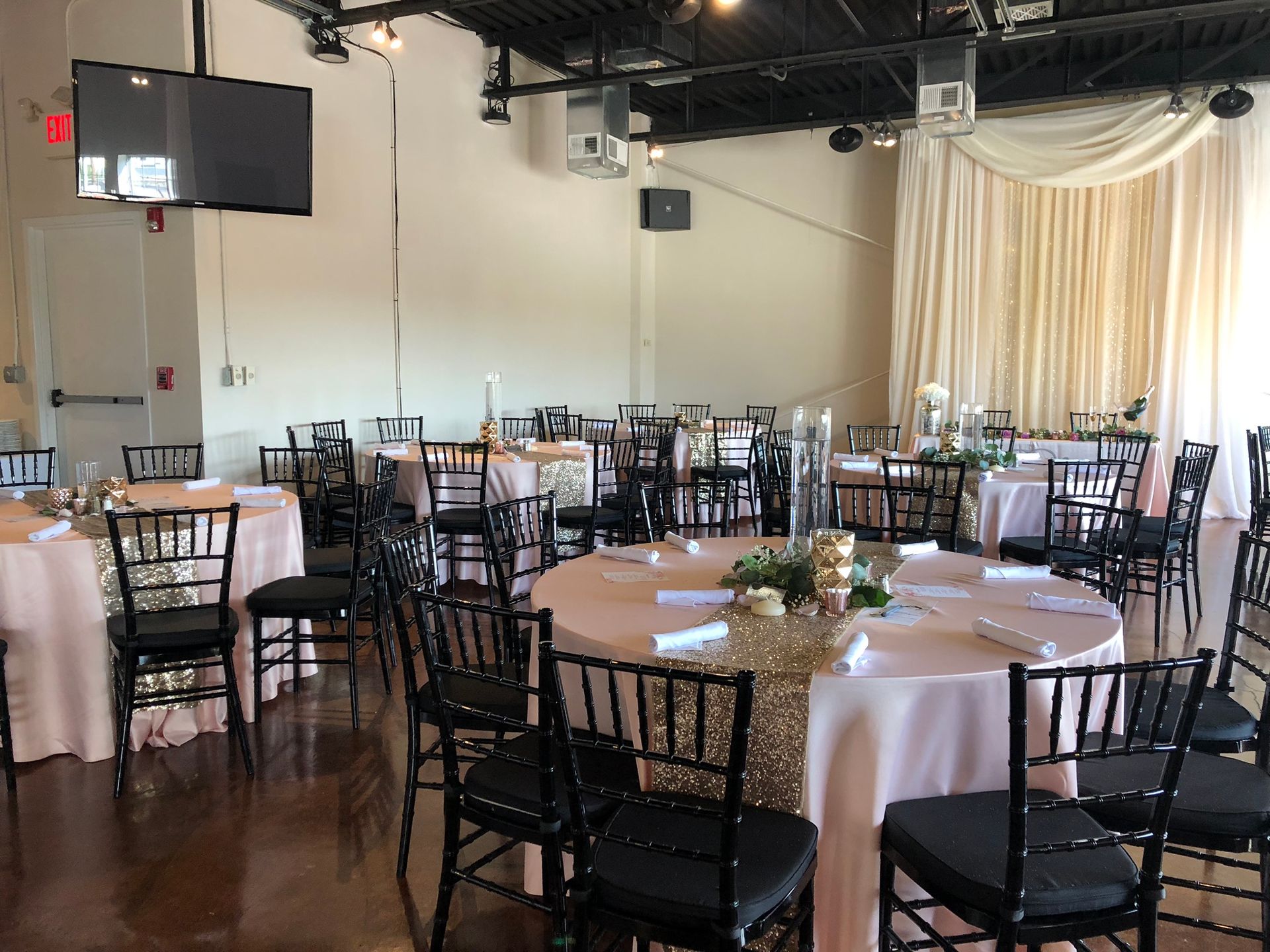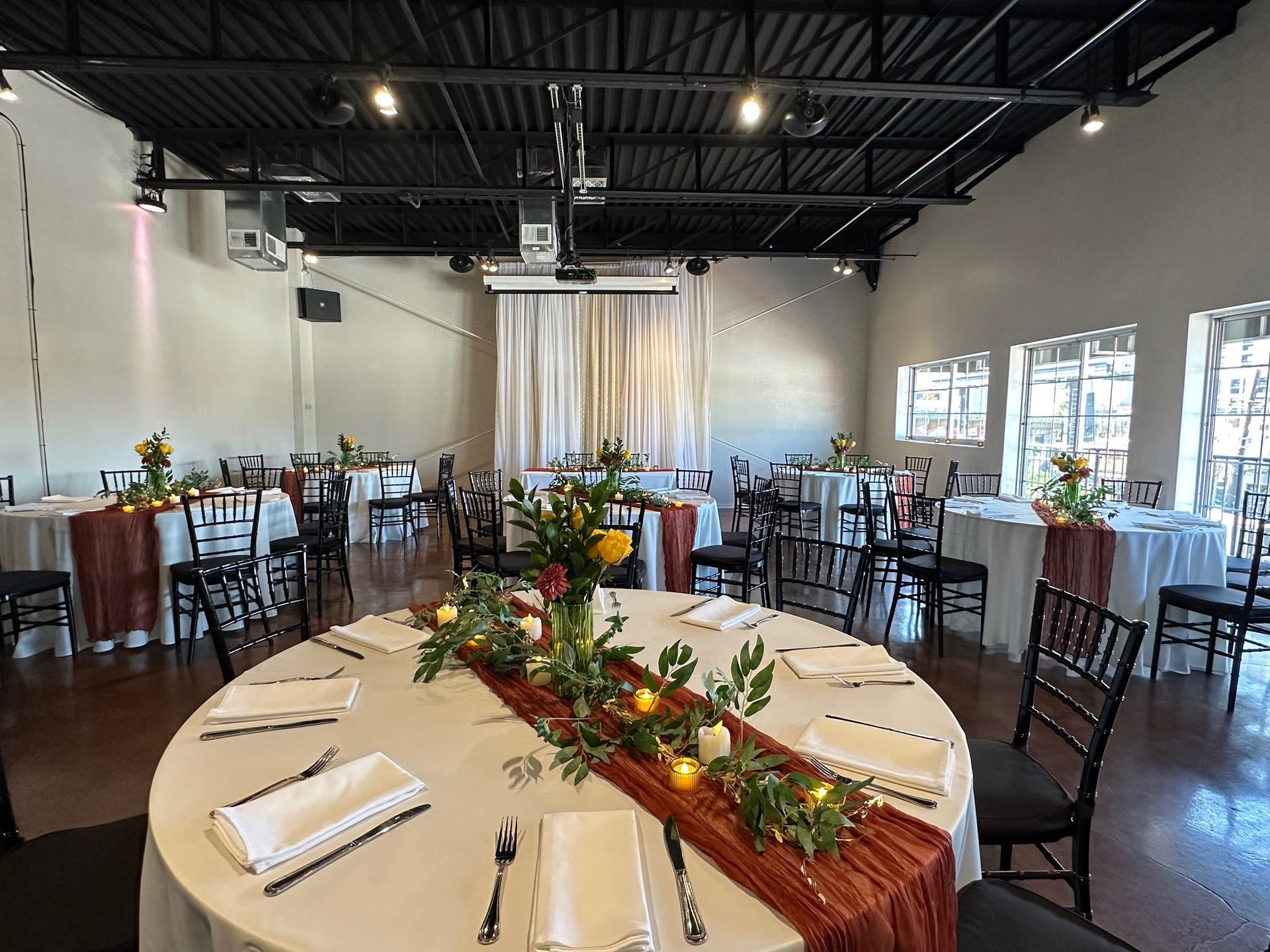 The penthouse is located on the third floor and features beautiful stained concrete floors, a large lighted chandelier, and two private balconies that overlook the rooftop deck. This room can accommodate up to 200 guests for a full seated dinner or 100 guests with a dance floor. This space is perfect for birthday parties, cocktail hours, wedding ceremonies, and corporate meetings.