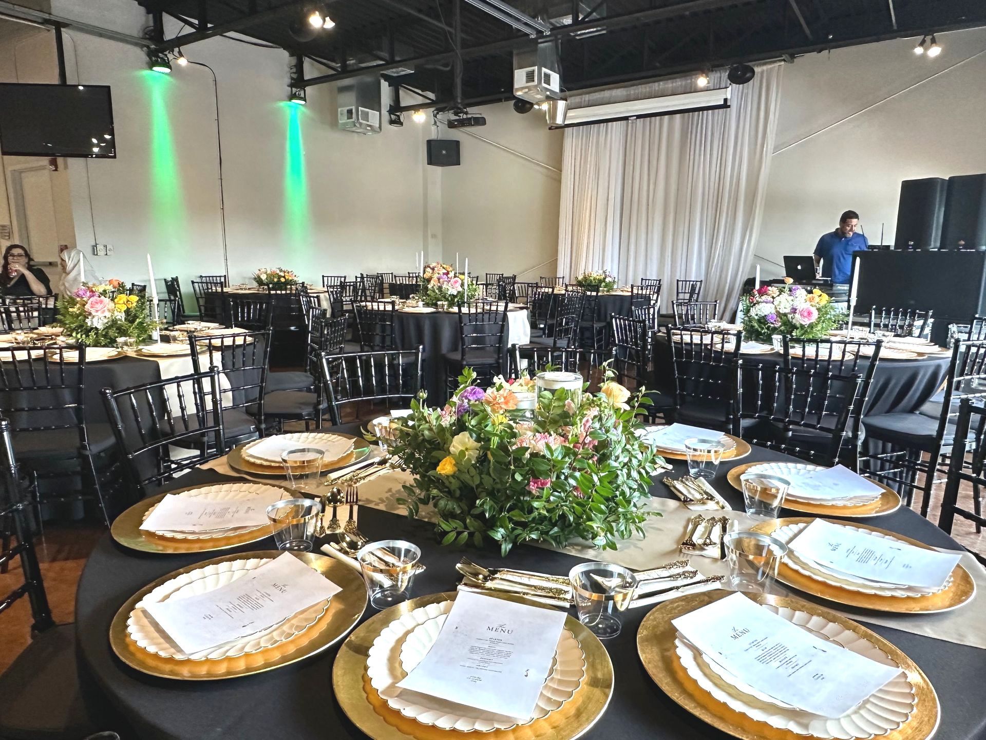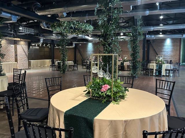 The first floor rustic yet elegant room is perfectly suited for any event. This room is 6,500 square feet and can accommodate up to 250 guests for a full seated dinner, including space for a dance floor or 400-450 cocktail style. It has red brick walls, exposed ceilings, and an original Coca-Cola mural from 1945. It features adjustable LED lighting, a separate bar/lounge area, beautiful sheer draping, a new maple wood dance floor, and lighted chandeliers.